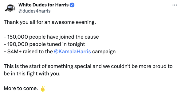 Our first White Dudes for Harris call was a HUGE success, Jason. Check it out: