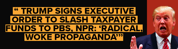 | For over 50 years, NPR has been a beacon of truth and integrity in a media landscape dominated by profit-driven sensationalism and partisan agendas. But now, NPR is under attack. Republicans are doing everything they can to defund and dismantle this trusted public institution. They want to replace NPR with more right-wing propaganda outlets like Fox News. We cannot let this happen. Sign the petition now to defend NPR >> | | | | - Progressive Turnout Project | BBC: Trump signs order to block funding to public radio; 05/02/2025 FOX NEWS: Trump signs executive order to slash taxpayer funds to PBS, NPR: ‘Radical, woke propaganda 05.02.2025 | | National Public Radio is not associated or affiliated with Progressive Turnout Project and has not sponsored or approved of this communication. | | | |