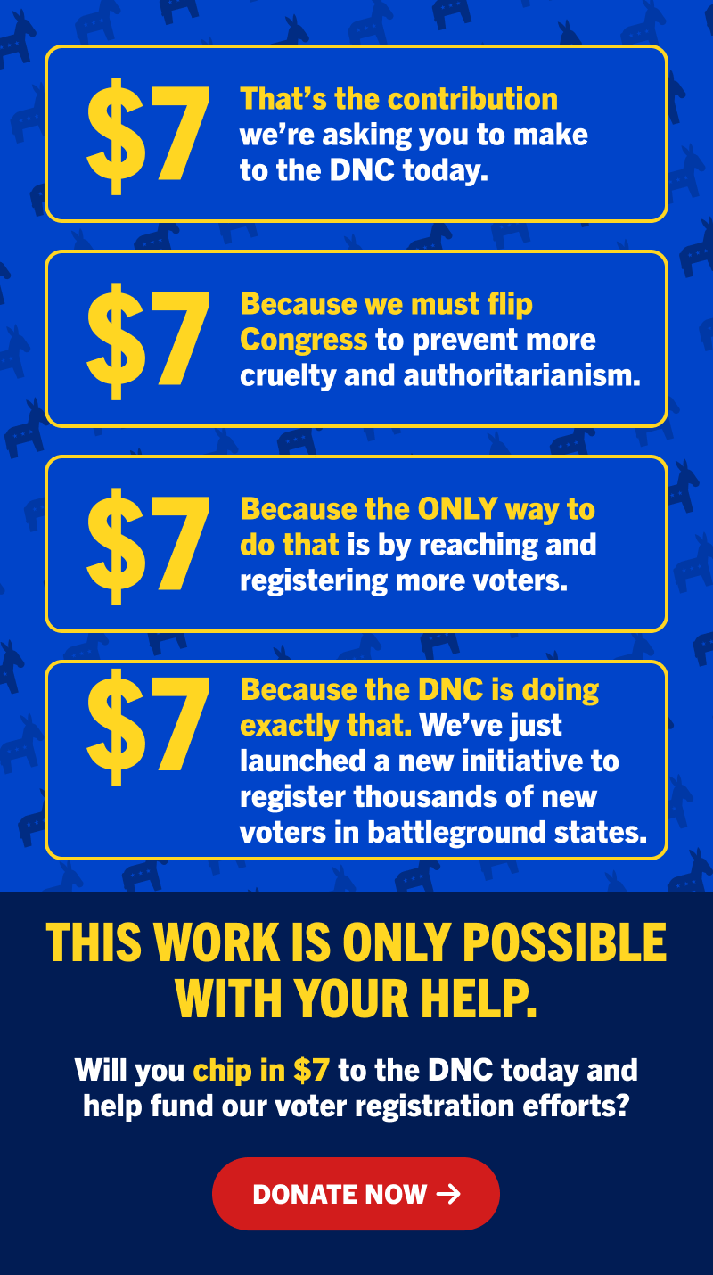 Contributions or gifts to the Democratic National Committee are not tax deductible. Paid for by the Democratic National Committee, www.Democrats.org, and not authorized by any candidate or candidate's committee.