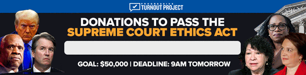 Sorry about that, but this is one of the most important bills in history. The Hard Truth Is: Brett Kavanaugh, Samuel Alito, and Clarence Thomas have HUNDREDS of ethics complaints against them… but NOTHING happens. So we’re doing everything in our power to help pass the Supreme Court Ethics Act and give Democrats in Congress the power to finally punish them! And with our end-of-month deadline approaching, we’re racing against the clock to see this through. That’s why we’re ACTIVATING a 300%-MATCH on all donations today. If we can gather another 829 donations before 9 AM tomorrow we’ll CRUSH our goal and help elect Democrats who will pass the Supreme Court Ethics Act. Over 100 Congressional Democrats have co-sponsored the Supreme Court Ethics Act… We’re SO CLOSE! Will you give $5 or anything you can to Progressive Turnout Project NOW?